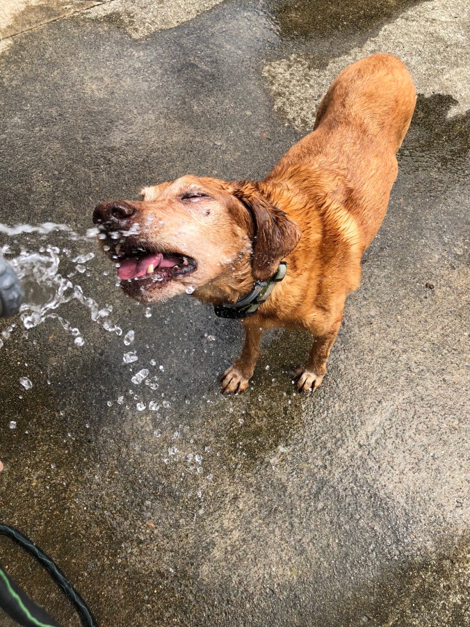 He was the escape artist. He knew how to open doors and some latch locks. And if he could get out, he would. My favorite time was shortly after I moved to Jacksonville. One of the children unlocked the gate and they were gone and for at least 3 hours. Justin was on the other side of the country and I’m driving around like a crazy woman crying in a brand new city and asking every one I see if they’ve seen them. Finally I see Ike sitting right past my next door neighbor’s house, near a weird drain thing (makes sense later). Still no Ollie. At least 30 min later I get a call from a local number (this is usually how I found them – they had my number embroidered in giant print on their collars). The person on the phone is right across the street from me at the park that overlooks the river. I get down there and he tells me that a homeless man jumped in the river (a few feet down and over a fence) to save him. What in the actual hell? Apparently he climbed down the storm drain to the river then was stuck. I was frantic and worried they’d want money (which I didn’t have) so I just thanked him and ran away. I left a wet homeless man in the park after saving my dog π³. This ππ»was him cooling off in the garage for an entire day. His eyes were bloodshot for over a week π³.
